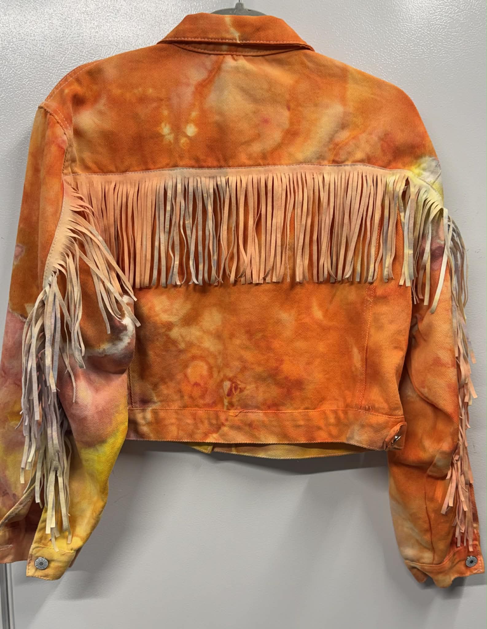 Ice Dyed OOAK orange/yellow fringed denim jacket