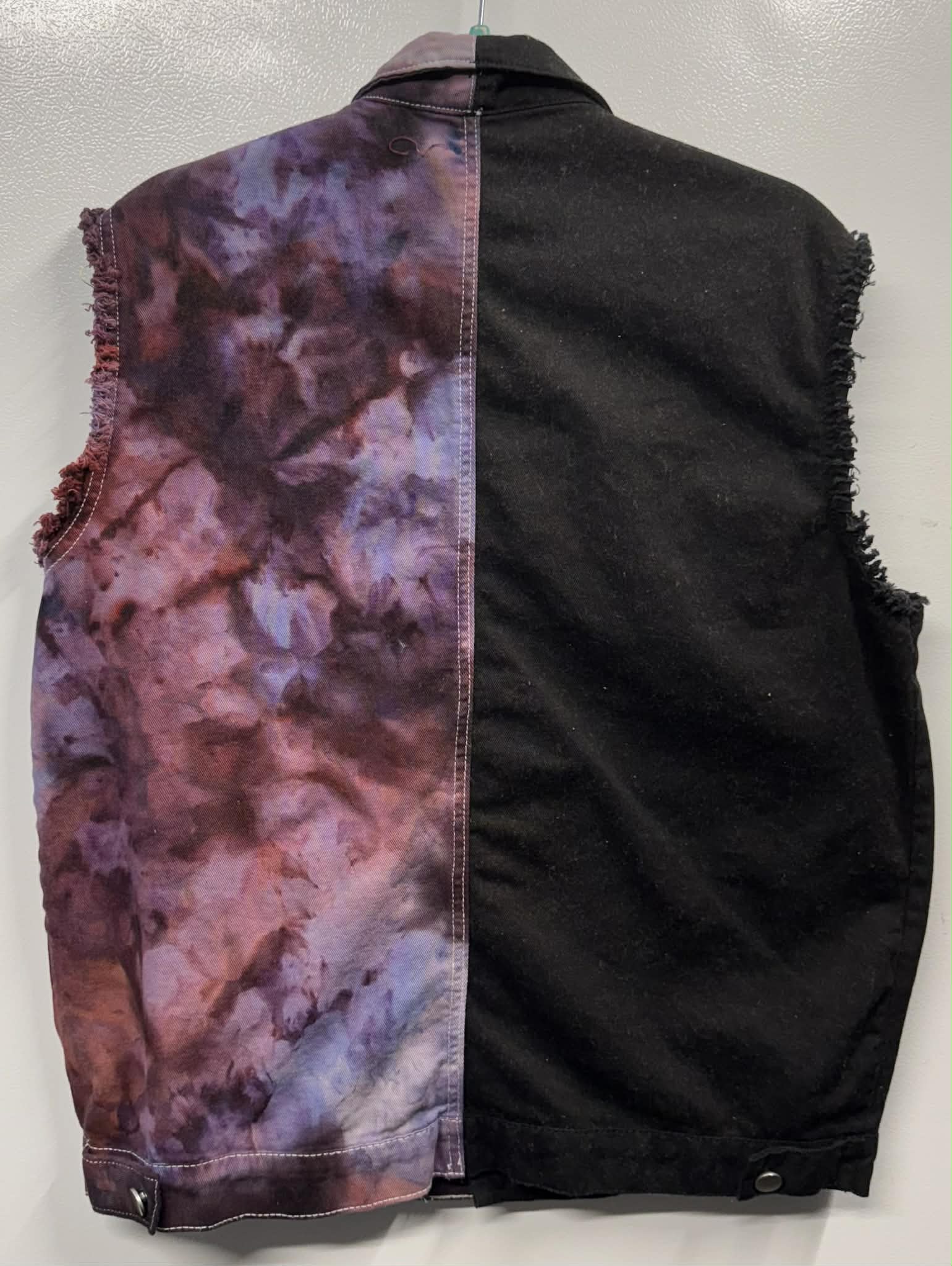 Half black half ice dyed pattern featuring purples and burgundy. Size L